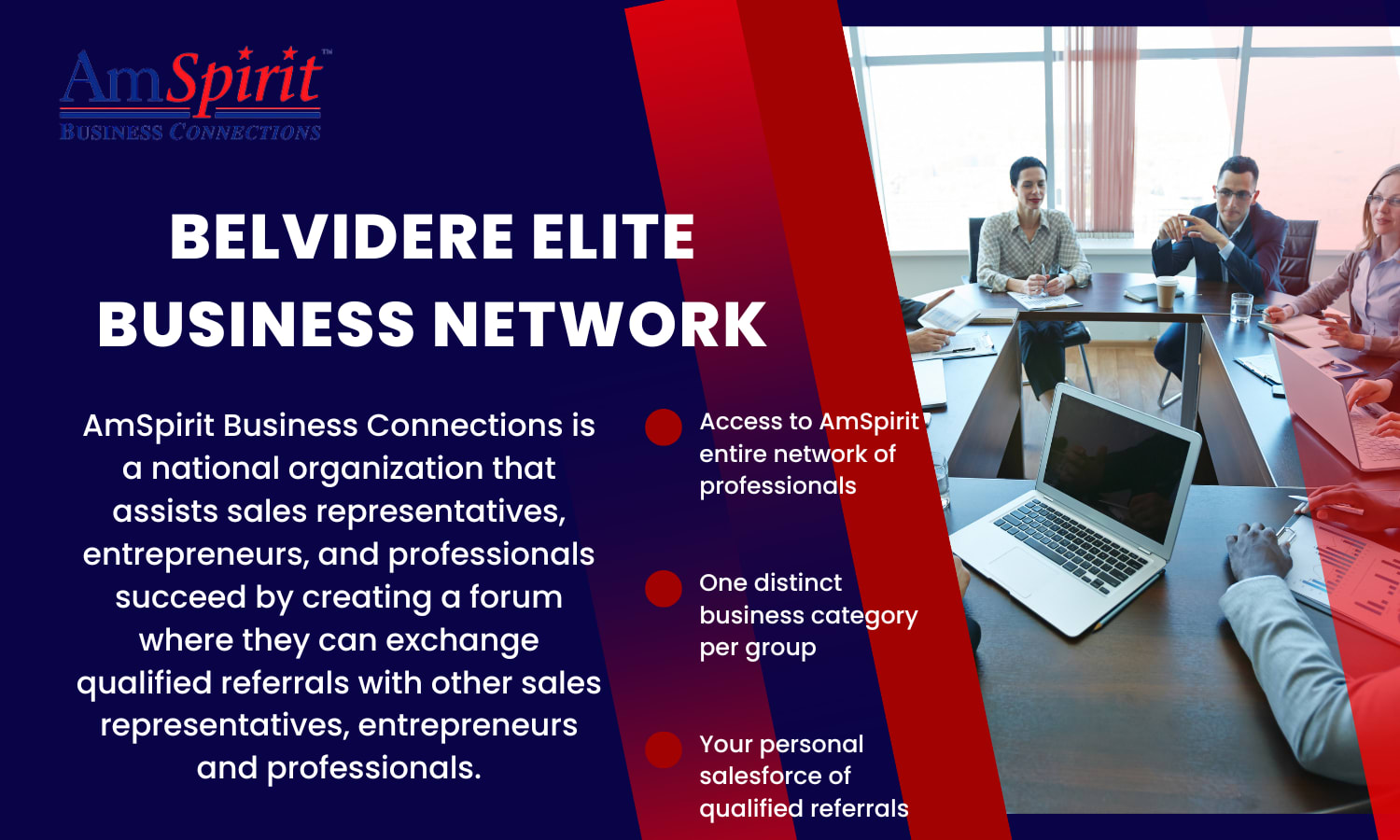 AmSpirit Business Connections is a national organization that assists sales representatives, entrepreneurs, and professionals succeed by creating a forum where they can exchange qualified referrals with other sales representatives, entrepreneurs and professionals.
