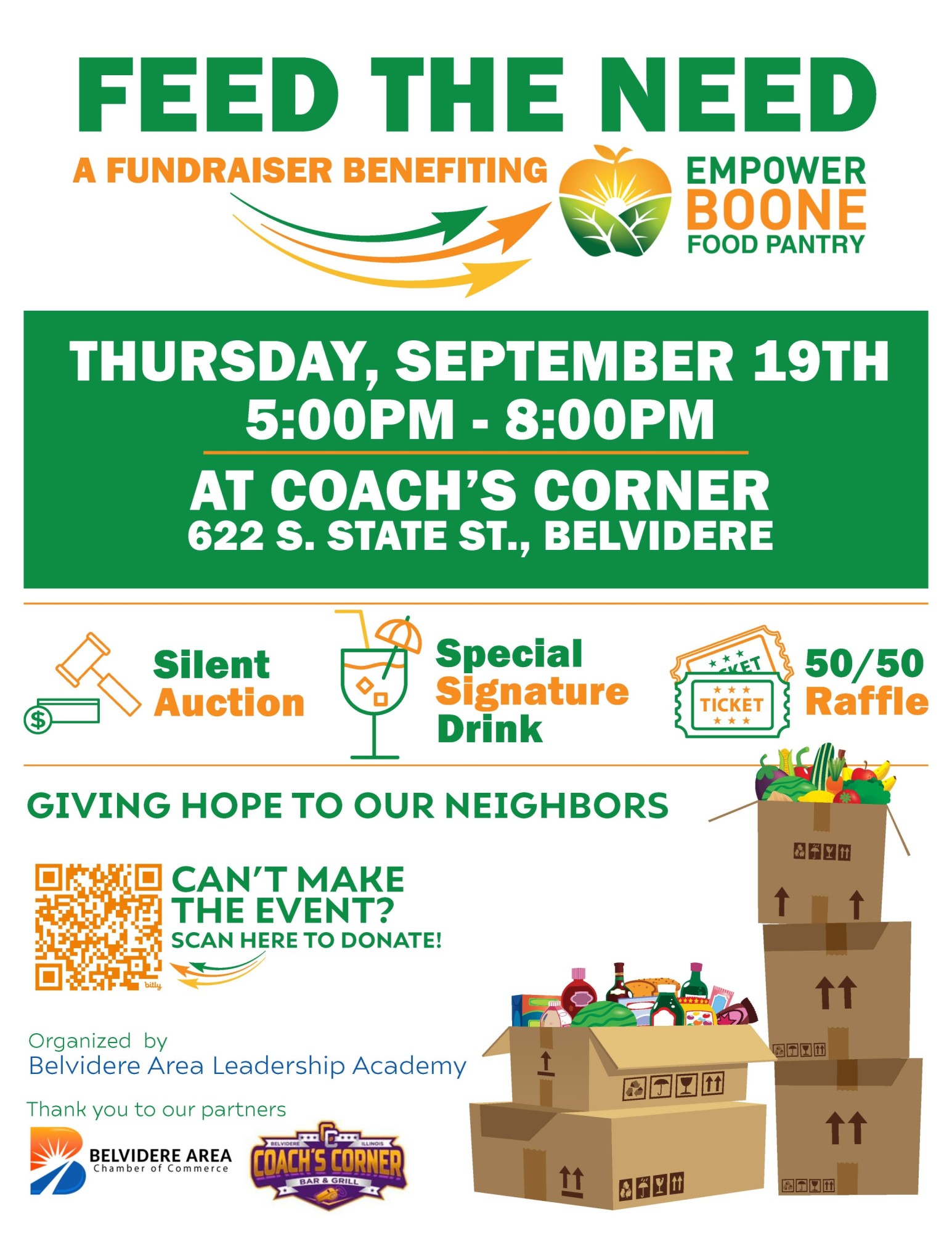 FEED THE NEED A FUNDRAISER BENEFITING THURSDAY, SEPTEMBER 19TH 5:00PM - 8:00PM AT COACH’S CORNER 622 S. STATE ST., BELVIDERE Organized by Belvidere Area Leadership Academy Thank you to our partners GIVING HOPE TO OUR NEIGHBORS