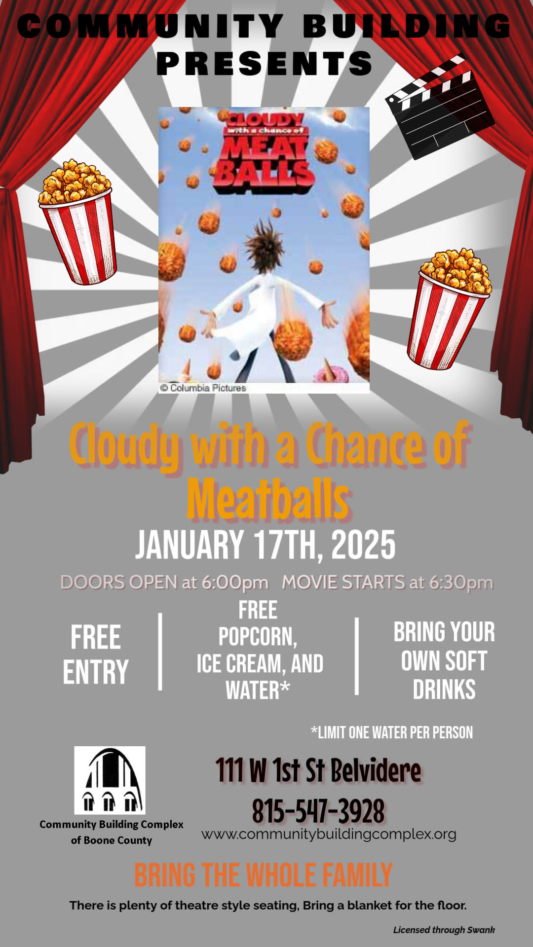 Join us for our FREE Movie Night at the Community Building featuring Cloudy with a Chance of Meatballs! Admission is free and we will be giving out FREE popcorn, ice cream sandwiches, and water (limit one bottle per person) and you are welcome to bring your own soft drinks. Everyone is welcome and all movies are family friendly. We have plenty of theater-style seating or bring a blanket for the floor. Doors open at 6 p.m. and movie starts at 6:30 p.m.