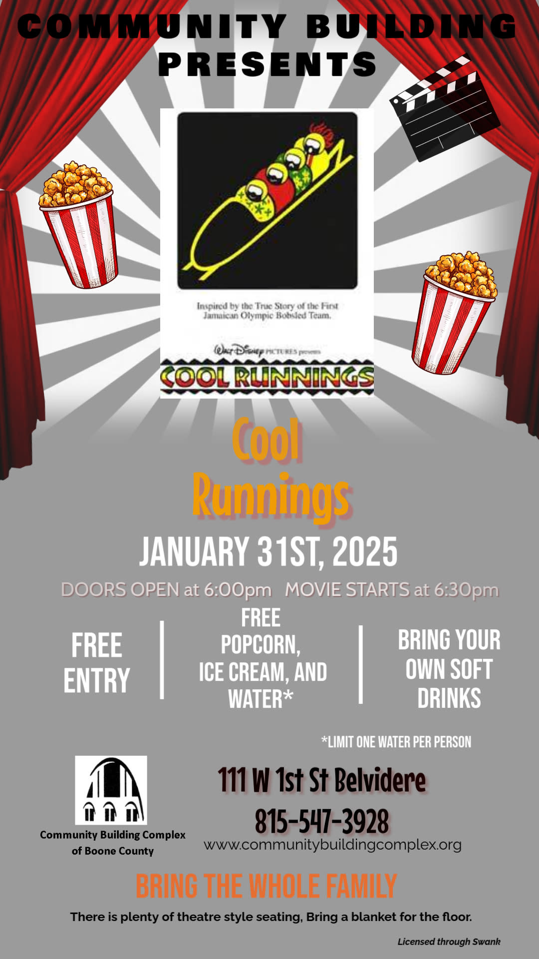 Join us for our FREE Movie Night at the Community Building featuring Cool Runnings! Admission is free and we will be giving out FREE popcorn, ice cream sandwiches, and water (limit one bottle per person) and you are welcome to bring your own soft drinks. Everyone is welcome and all movies are family friendly. We have plenty of theater-style seating or bring a blanket for the floor. Doors open at 6 p.m. and movie starts at 6:30 p.m.