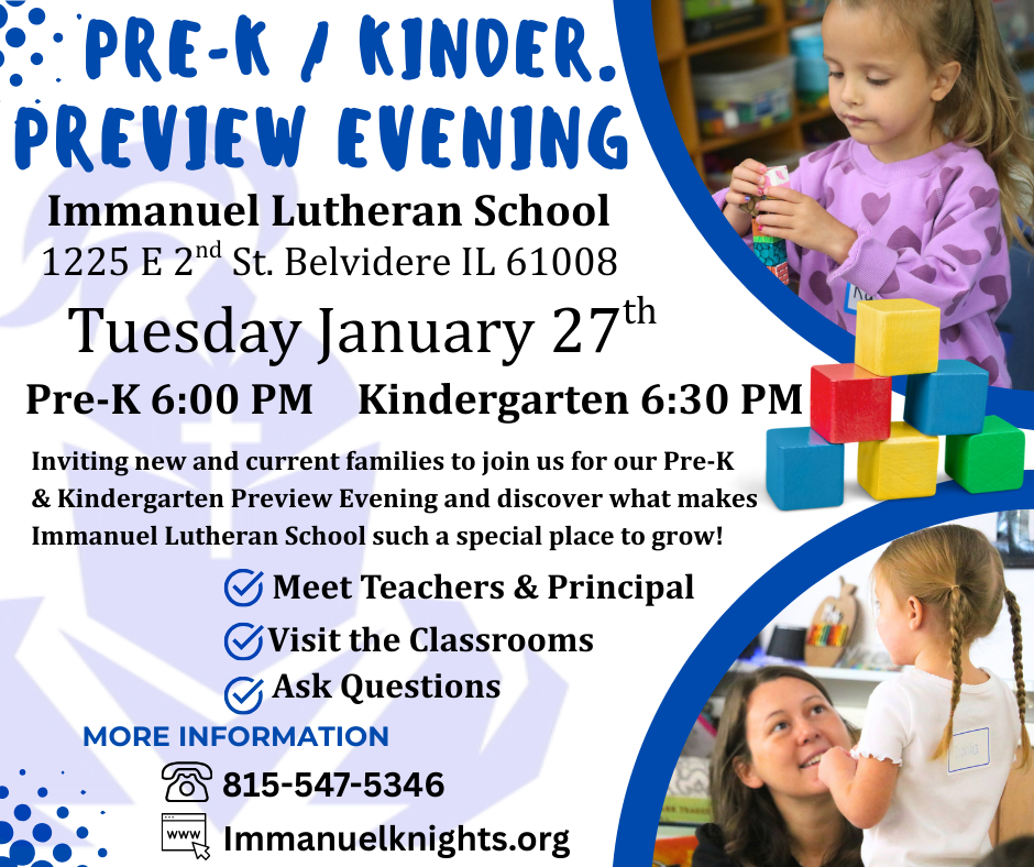 Inviting new and current families to join us for our Pre-K & Kindergarten Preview evening and discover what makes Immanuel Lutheran School such a special place to grow!