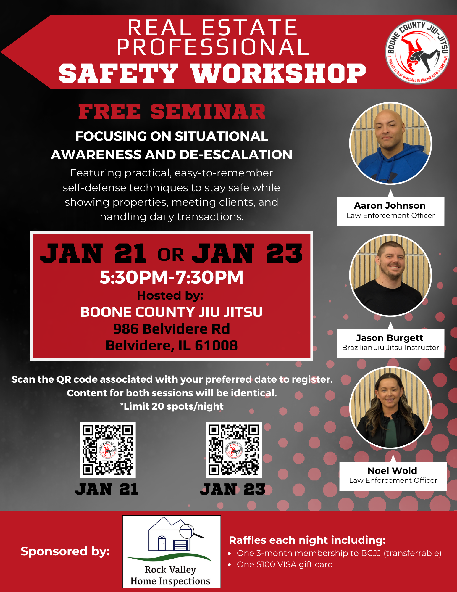 Free Seminar focusing on situational awareness and de-escalation. This seminar will feature practical, easy-to-remember self-defense techniques to stay safe while showing properties, meeting clients, and handling daily transactions. There will also be raffles each night including One three-month membership to BCJJ and One $100 VISA gift card!