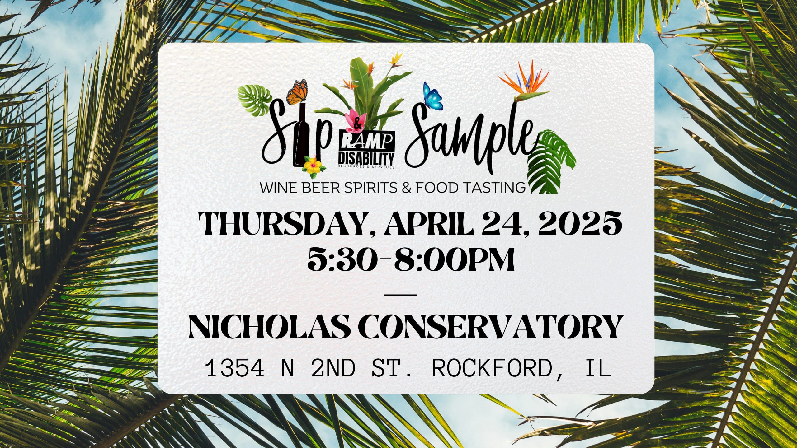 Join us for Sip & Sample, a one-of-a-kind evening at Nicholas Conservatory in Rockford, IL! Indulge in delicious wine, beer, spirits, and food from local businesses, explore the butterfly exhibit, and stroll among exotic plants of the conservatory.
