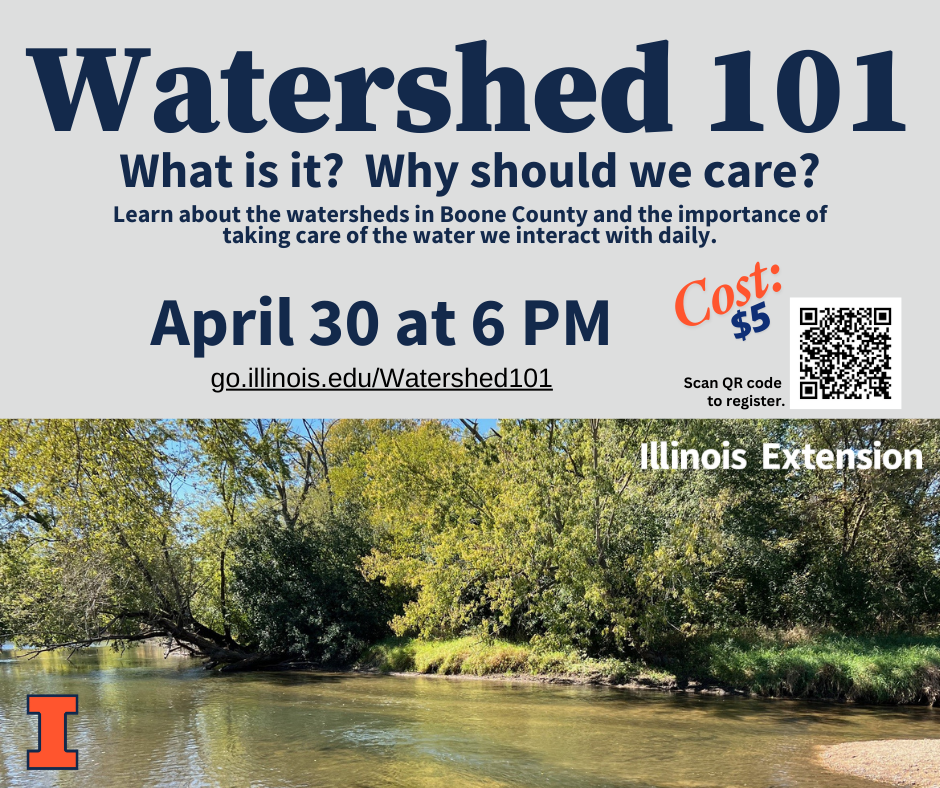 A watershed provides homes, communities, and businesses with fresh drinking water, recreational opportunities, and other vital resources. So, what exactly is a watershed? How does it work and why should we care? Watershed 101 will give you the basics of understanding our local watersheds and the importance of taking care of the water we interact with on a daily basis. Join Nicole Haverback, Illinois Extension Watershed Outreach Associate for this informational presentation. Space is limited and registration for this presentation is required.