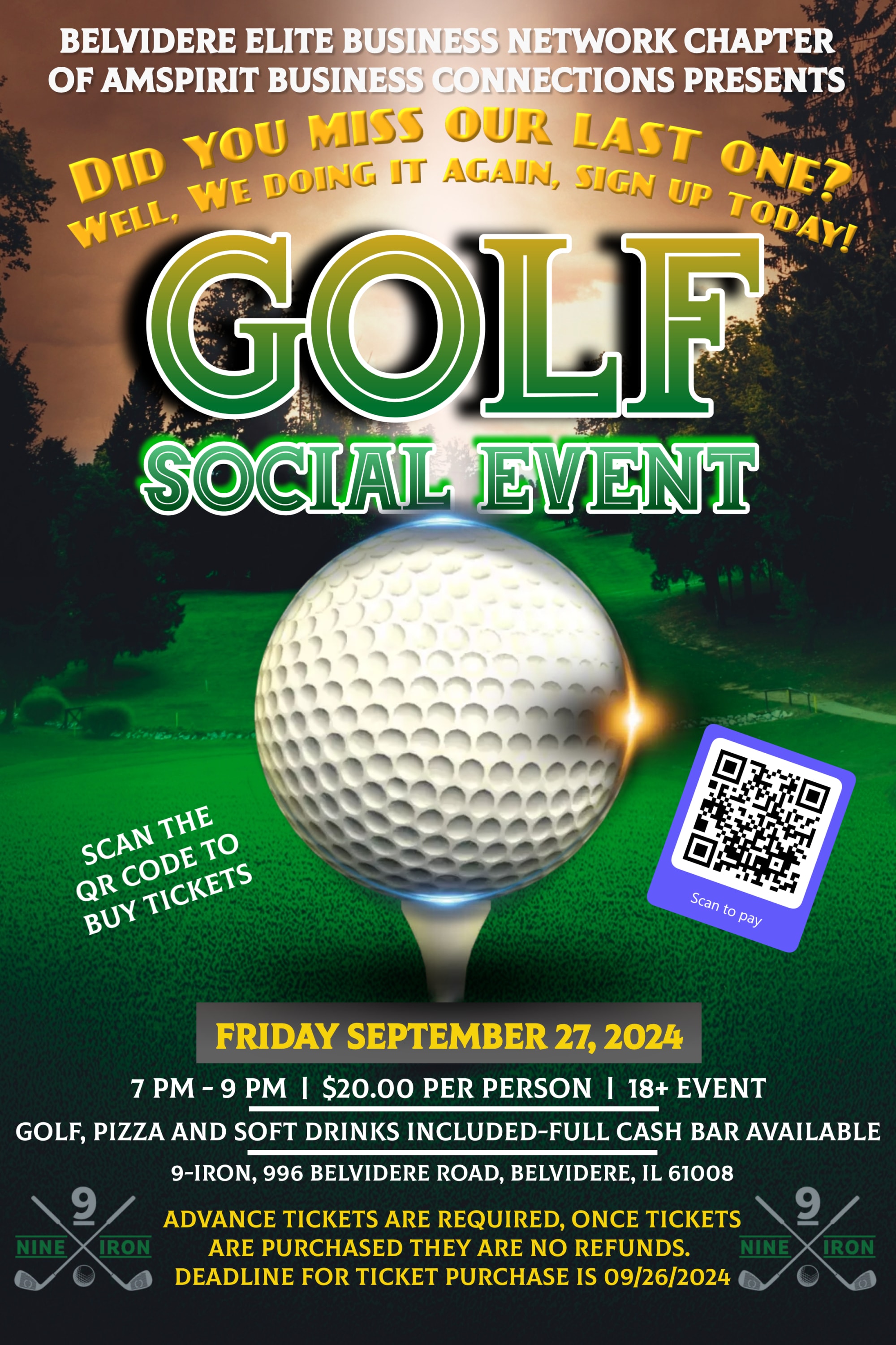 It is a $20 per-person event. Golf, Pizza, and Soft drinks are included. A Full Cash Bar is available as well.
