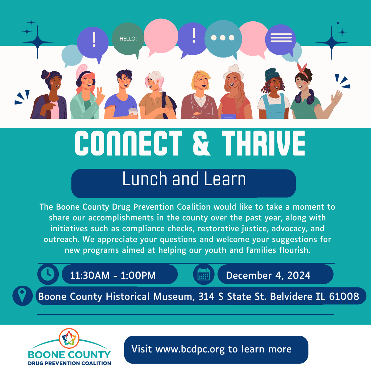Join us for the December Lunch and Learn with The Boone County Drug Prevention Coalition. They will be sharing their accomplishments with the community over the past year. Some of their initiatives are compliance checks, restorative justice, advocacy, and outreach. Boone County Drug Prevention Coalition welcomes your suggestions for new programs aimed at helping our youth and families flourish.