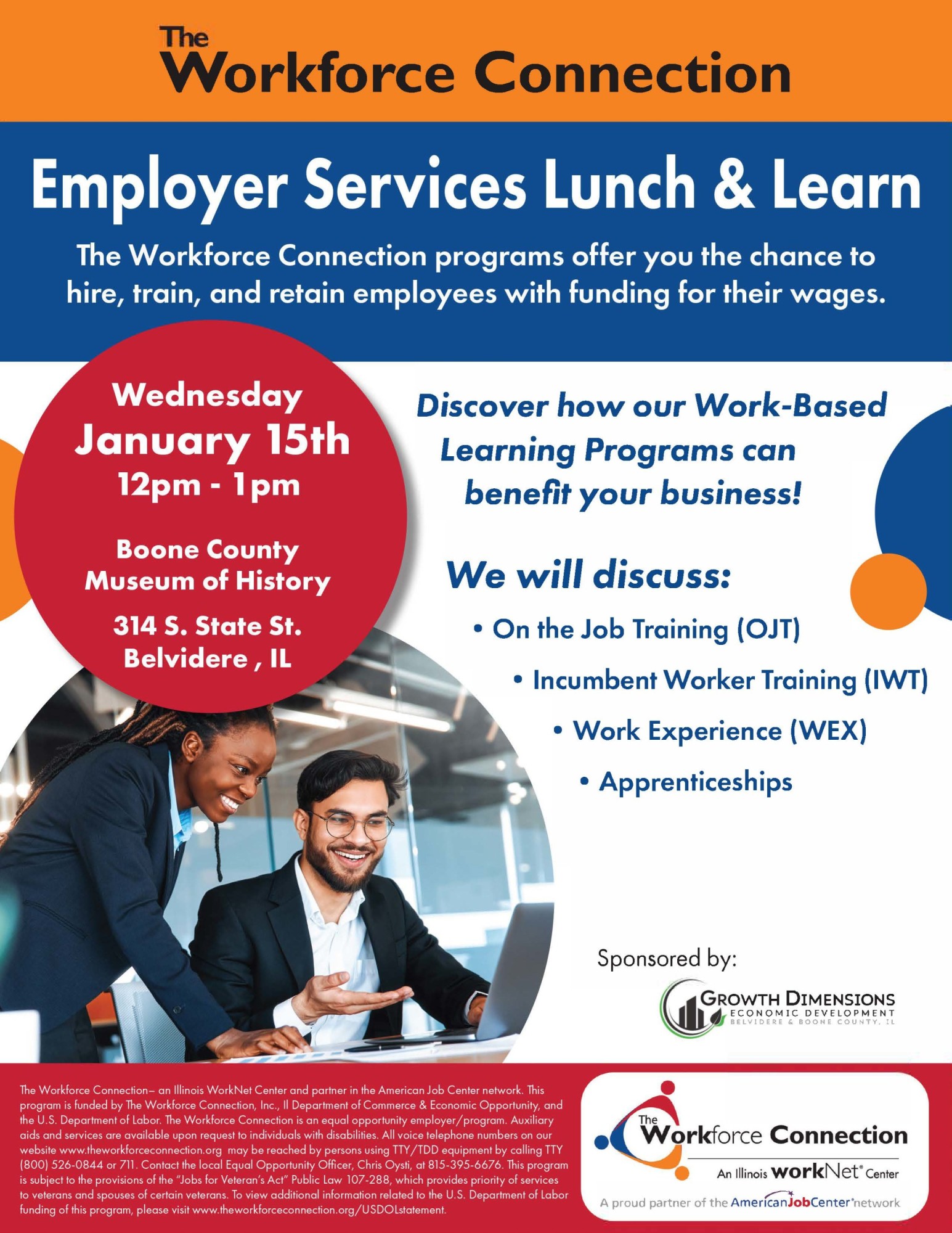 Join us for the January Lunch and Learn with The Workforce Connection. They will share how their programs offer you the chance to hire, train, and retain employees with funding for their wages. The Workforce Connection will specifically discuss on-the-job training, incumbent worker training, work experience, and apprenticeships.