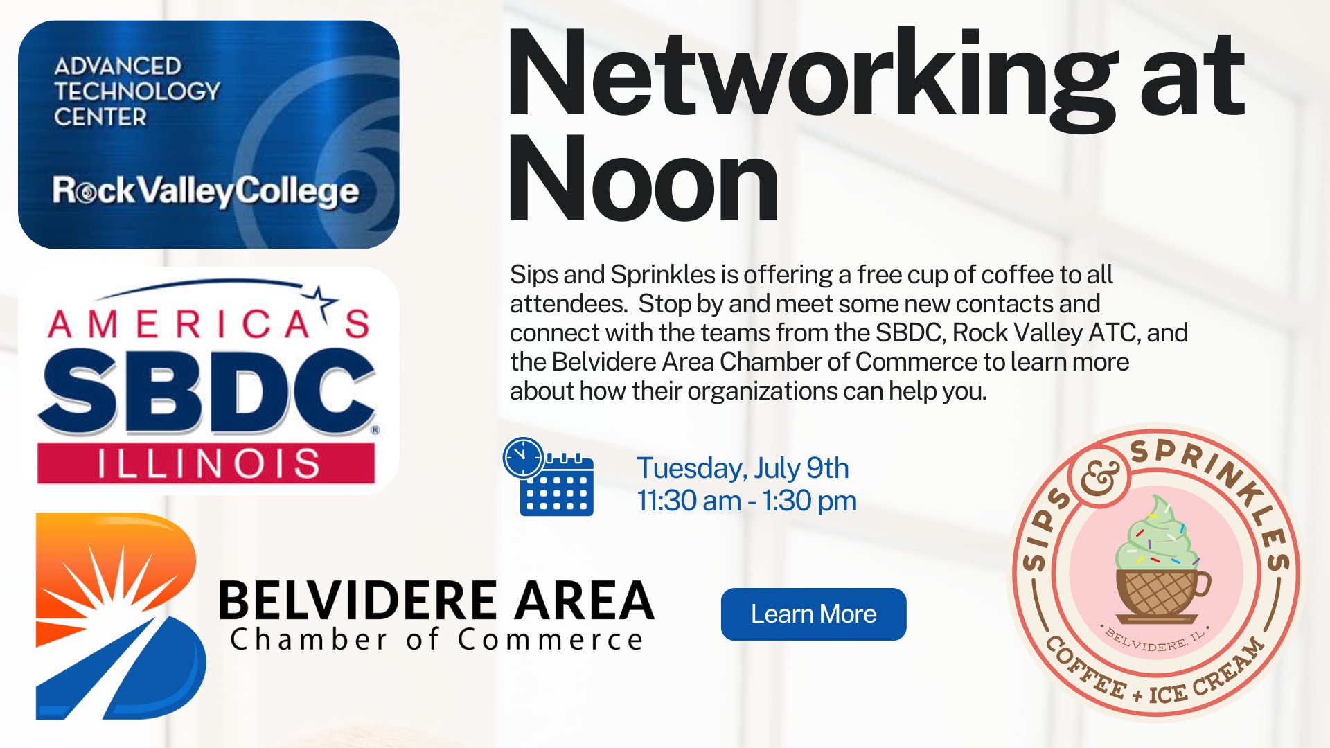 Sips and Sprinkles is offering a free cup of coffee to all attendees. Stop by and meet some new contacts and connect with the teams from the SBDC, Rock Valley ATC, and the Belvidere Area Chamber of Commerce to learn more about how their organizations can help you.
