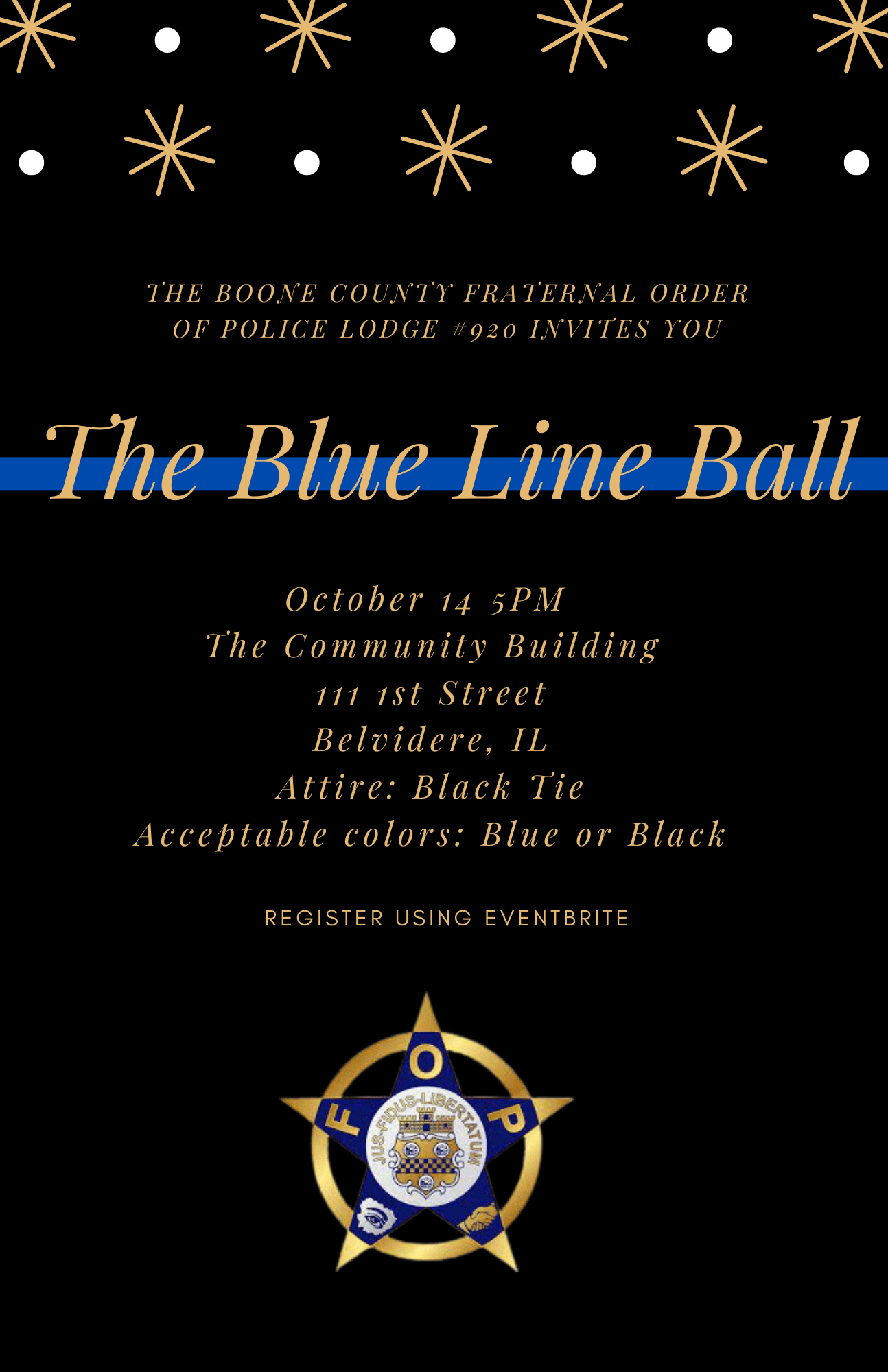 We cordially invite you to join us for a truly remarkable occasion—the 1st Annual Blue Line Ball sponsored by the esteemed Boone County Fraternal Order of Police Lodge #920 on October 14, 2023. We are humbled by the unwavering support our community demonstrates for the police department, and now, we extend a heartfelt request for your presence to celebrate the exceptional work carried out by our first responders. This prestigious fundraising event aims to bolster the Belvidere Police Department's Feed the Need Campaign, as well as provide vital resources to other community providers who generously contribute to our police force. Together, we can make a tangible difference in the lives of those we serve, fostering a safer and more prosperous community for all. In the spirit of solidarity, we kindly ask that you dress in blue and black attire, symbolizing the unity between law enforcement and the community. Let us come together, showcasing our collective support and admiration for the selfless individuals who dedicate their lives to protecting and serving. Your attendance at this memorable gathering is paramount to its success. We eagerly anticipate your presence, as your participation will undoubtedly contribute to the vibrancy and impact of the event. To secure your place and share in this unforgettable evening, please register below. Should you have any inquiries regarding the event, please do not hesitate to reach out to Ofc. Michelle Schwartz at schwartz@belviderepoliceil.gov. We are more than happy to provide any additional information you may require. Thank you for your continued support, and we eagerly await the privilege of seeing you at the 1st Annual Blue Line Ball. Let us unite as a community, honoring our local heroes and fostering a future filled with safety, harmony, and compassion. Register now and join us in this momentous occasion! https://www.eventbrite.com/e/blue-line-ball-tickets-657015409777?aff=oddtdtcreator