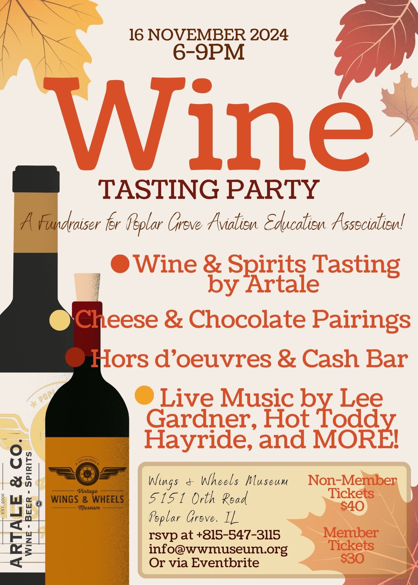 Join us at the Wings & Wheels Museum for a Wine Tasting Party. This Event is a fundraiser for Poplar Grove Aviation Education Association! The wine and spirits tasting is by Artale. We will have Cheese & Chocolate Pairings, Hors d'oeuvres, a cash bar, and Live Music by Lee Gardner, Hot Toddy Hayride, and MORE!